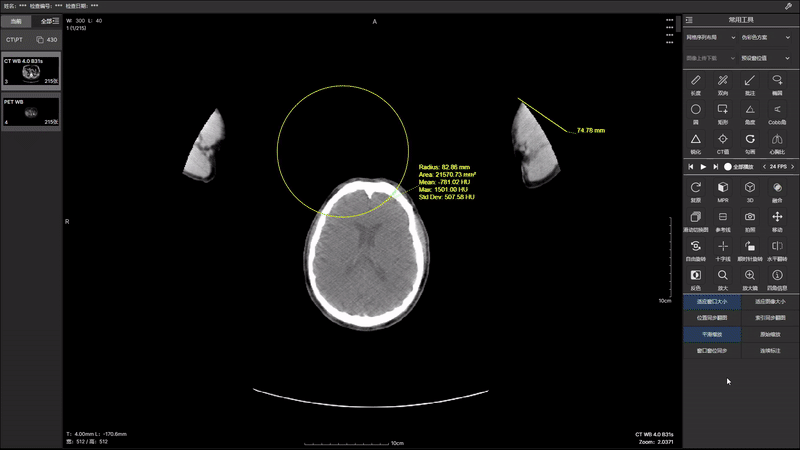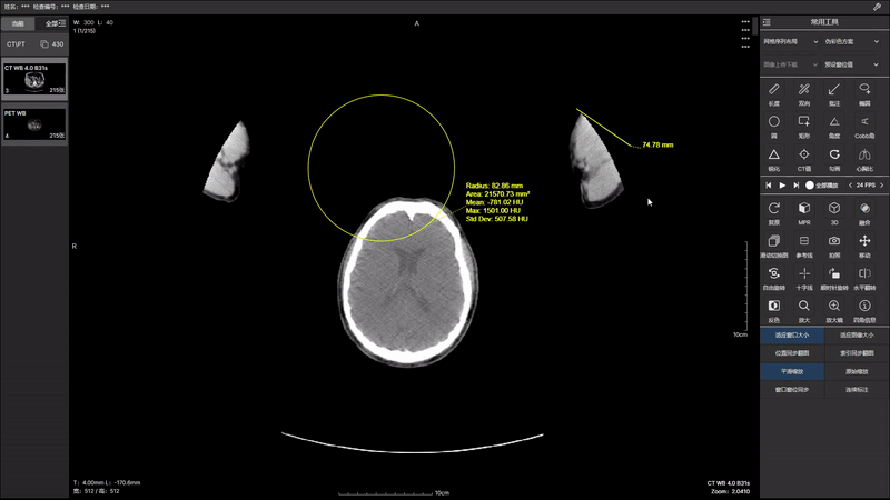 通过先进的算法和技术,我们在 2.0 版本中实现了 PT(正电子发射断层扫描)和 CT(计算机断层扫描)图像的无缝融合。这项突破性技术将为医生提供更全面、 更立体的患者图像,并且2.0 版本的图像融合带来了更高的分辨率和更丰富的图像细节。医生能够更准确地识别病变、评估组织状态,提高诊断的灵敏性和特异性, 为患者制定个性化的治疗方案提供更强有力的支持。医生可以更轻松地导航和比对 PT 和 CT 图像,提高工作效率。智能化的界面设计使操作更直观。 升级你的医学影像诊断体验,与 PT CT 图像融合 2.0 版本一同开启医学影像新时代。提升准确性,优化工作流程,为患者提供更全面的医疗服务。