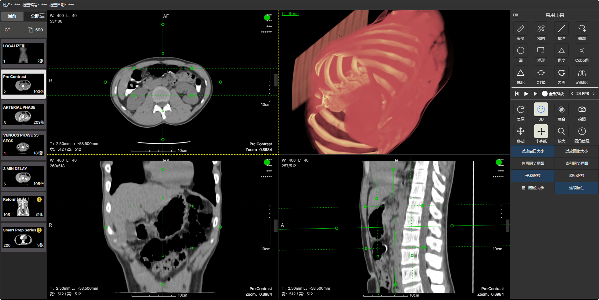 PACS三维重建模块引入了先进的技术,为医生提供了更全面、立体的患者解剖结构展示。支持多种重建技术,包括VR、MPR、CPR、MIP等,满足不同医学领域的需求。与主系统无缝集成,确保医生在三维重建模块上获取的数据与工作站上一致。用户友好的操作界面支持多种操作方式,包括旋转、缩放、平移等,方便医生进行立体解剖结构的查看。高度精准的重建结果为医生提供更详细、直观的患者解剖结构信息,助力医学影像的深度诊断与手术规划。